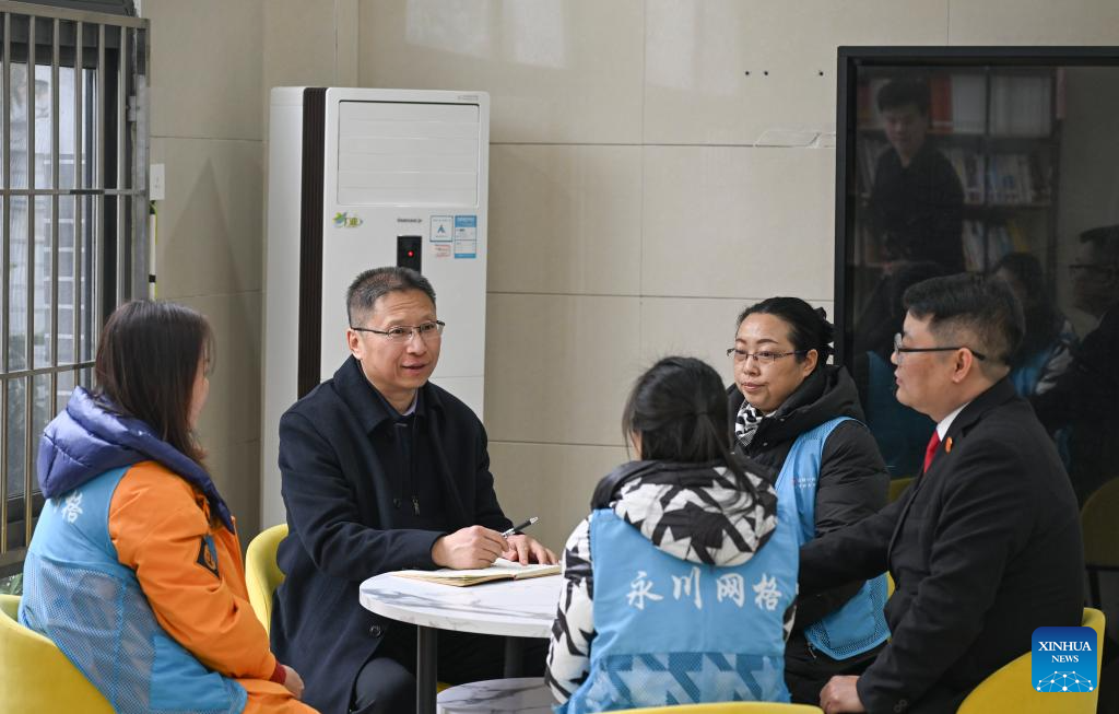 Fu Guotao (C) conducts a survey on grassroots governance at a community in Yongchuan District of Chongqing, southwest China, Feb. 11, 2025. (Xinhua/Wang Quanchao)