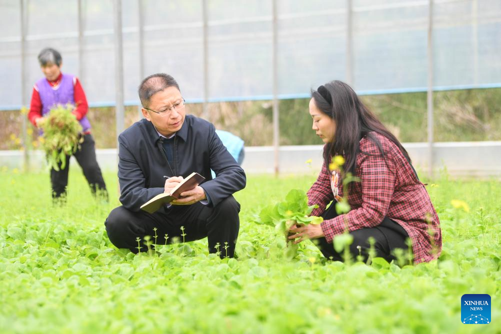 Fu Guotao (L) conducts a survey on rural revitalization in Jingsheng Village of Wujian Town in Yongchuan District of Chongqing, southwest China, Feb. 11, 2025. (Xinhua/Wang Quanchao)