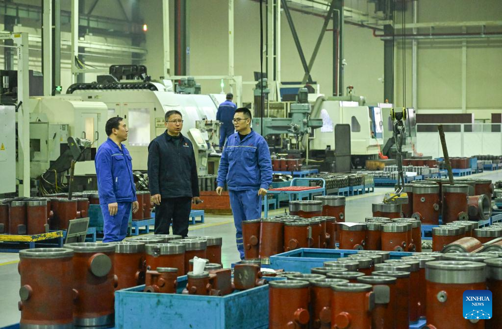 Fu Guotao (L) communicates with colleagues at the workshop of Chongqing Hongjiang Machinery Co., Ltd. in Chongqing, southwest China, Feb. 11, 2025. (Xinhua/Wang Quanchao)