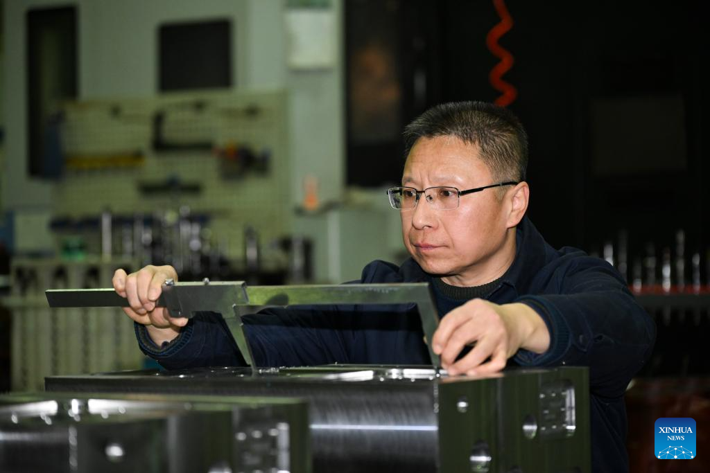 Fu Guotao works at the processing workshop of Chongqing Hongjiang Machinery Co., Ltd. in Chongqing, southwest China, Feb. 11, 2025. (Xinhua/Wang Quanchao)