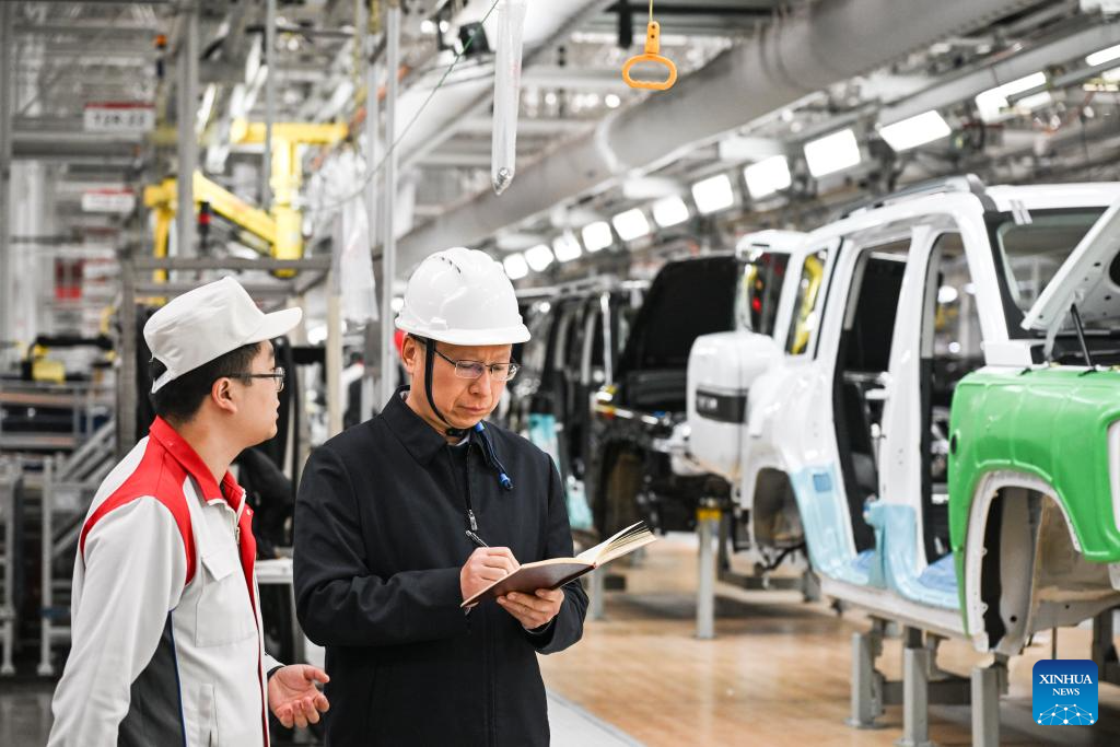 Fu Guotao (R) conducts a survey at an intelligent production base of the Great Wall Motors (GWM) in Yongchuan District of Chongqing, southwest China, Feb. 11, 2025. (Xinhua/Wang Quanchao)