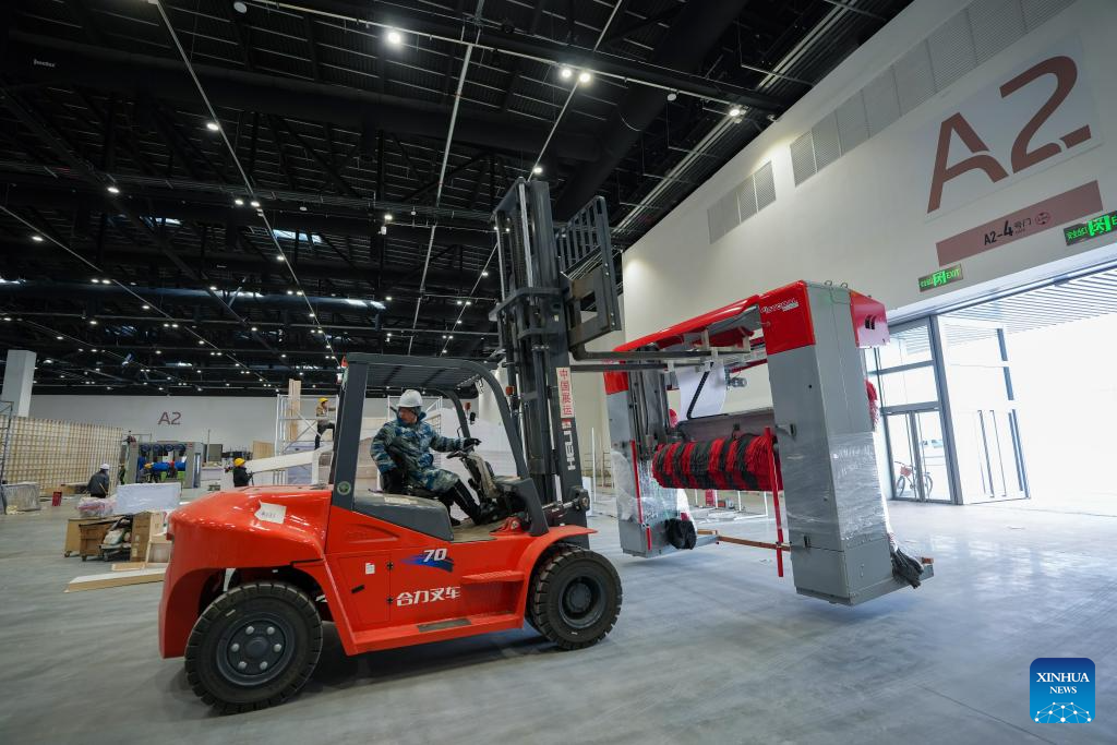 Staff members set up exhibitions at the Capital International Exhibition & Convention Center(CIECC) in Shunyi District of Beijing, capital of China, Feb. 19, 2025. CIECC is a comprehensive exhibition venue integrating exhibition venues, conference centers and hotels. The construction of the venue officially began in September 2021, and the exhibition center and conference center completed construction in December 2024, with the conditions for operation.