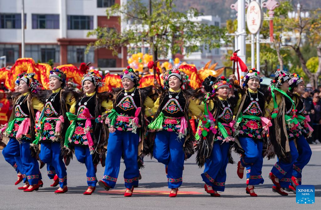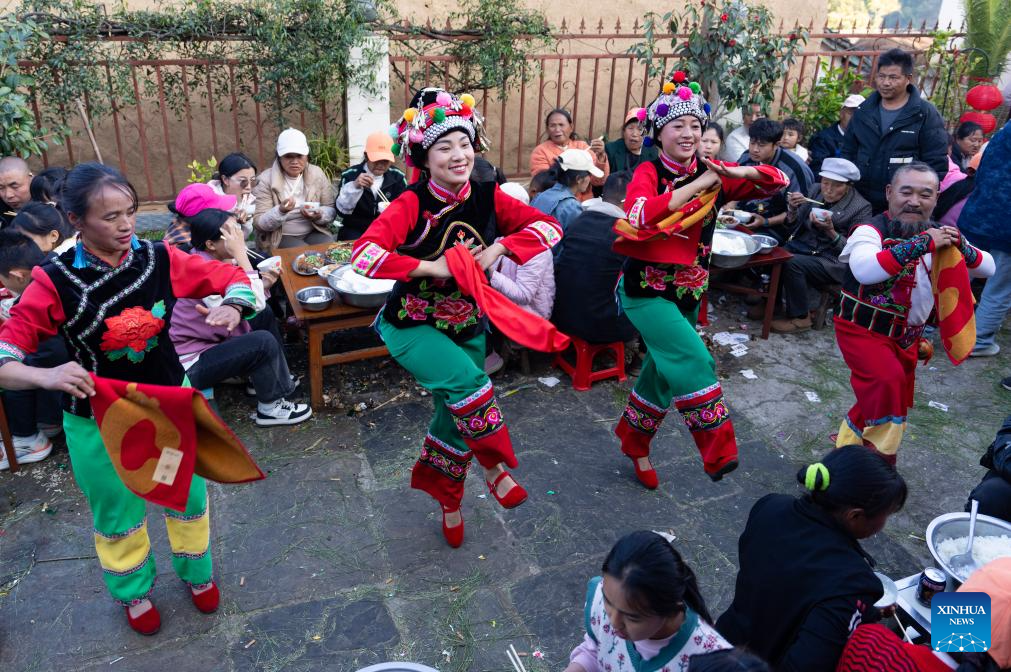 Lu Lihua (C) performs Yizu Tiaocai, a traditional dance of the Yi ethnic group, at a wedding in Yongzheng Village of Baohua Town, Nanjian Yi Autonomous County, southwest China's Yunnan Province, Feb. 7, 2025. (Xinhua/Chen Xinbo)