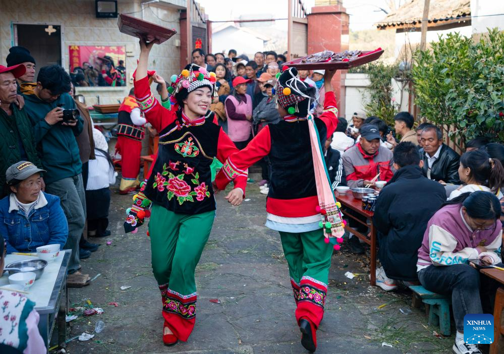 Lu Lihua (L, front) performs Yizu Tiaocai, a traditional dance of the Yi ethnic group, at a wedding in Yongzheng Village of Baohua Town, Nanjian Yi Autonomous County, southwest China's Yunnan Province, Feb. 7, 2025. (Xinhua/Chen Xinbo)
