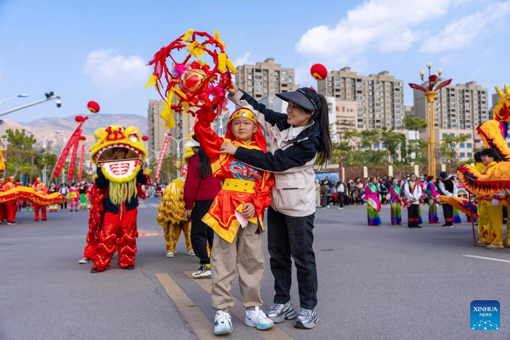 Lu Lihua (C) performs a dance of the Yi ethnic group during the annual Dragon Lantern Festival in Nanjian Yi Autonomous County, southwest China's Yunnan Province, Feb. 6, 2025. (Xinhua/Chen Xinbo)