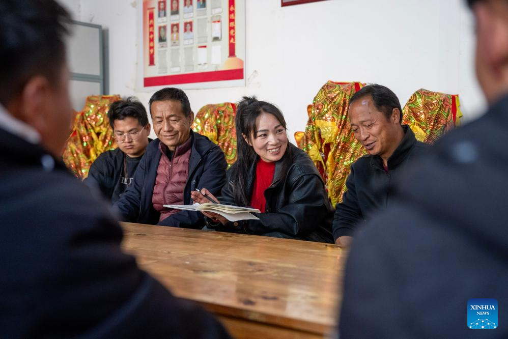 Lu Lihua (C) conducts a survey on cultural life of the Bulang ethnic group at Luodihe Village of Gonglang Town in Nanjian Yi Autonomous County, southwest China's Yunnan Province, Feb. 17, 2025. (Photo by Shi Zhihong/Xinhua)
