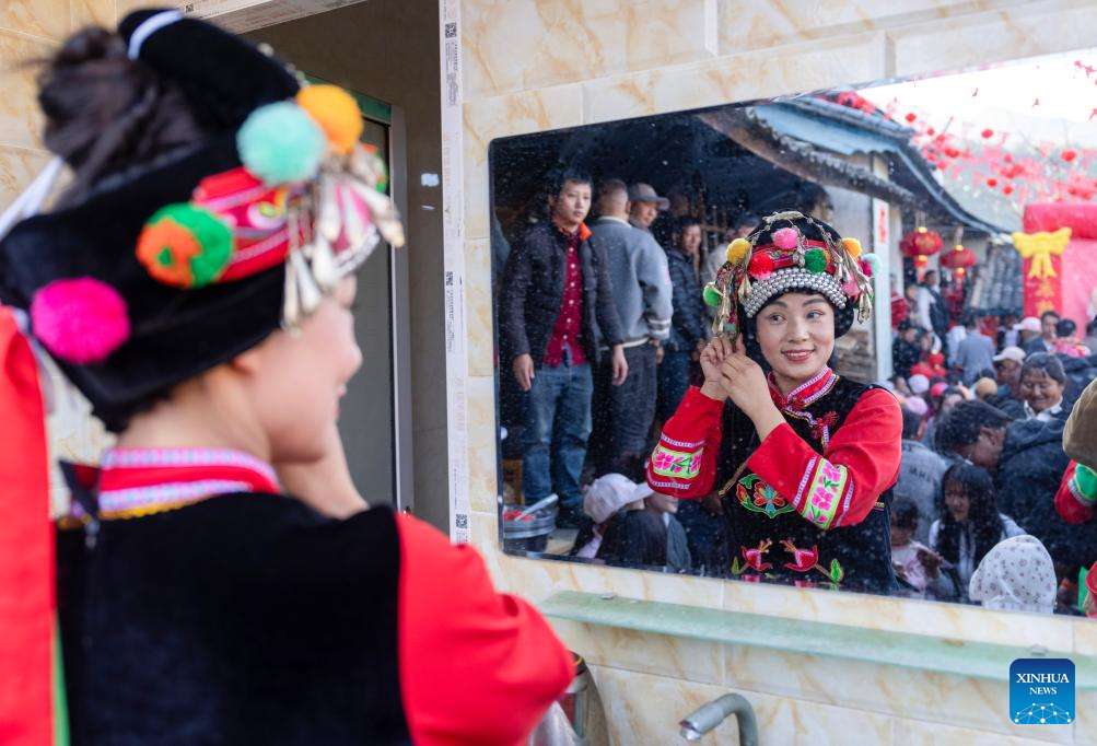 Lu Lihua prepares to perform Yizu Tiaocai, a traditional dance of the Yi ethnic group, at Yongzheng Village of Baohua Town in Nanjian Yi Autonomous County, southwest China's Yunnan Province, Feb. 7, 2025. (Xinhua/Chen Xinbo)