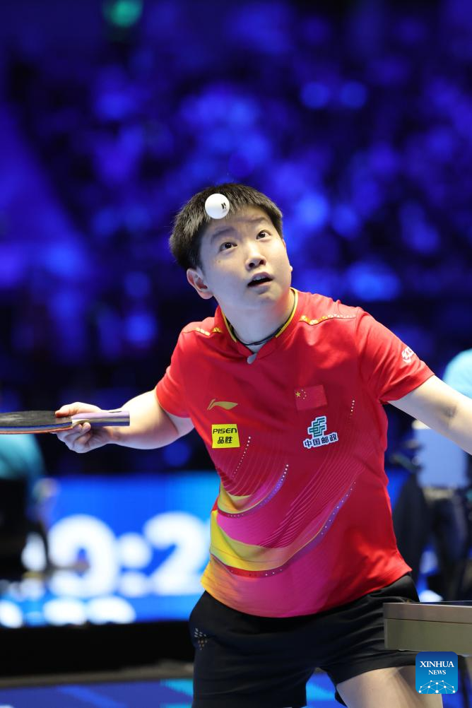 Sun Yingsha of China hits a return during the women's singles group 1 match against Sreeja Akula of India at the 34th ITTF-ATTU Asian Cup table tennis tournament in Shenzhen, south China's Guangdong Province, Feb. 20, 2025. (Xinhua/Liang Xu)
