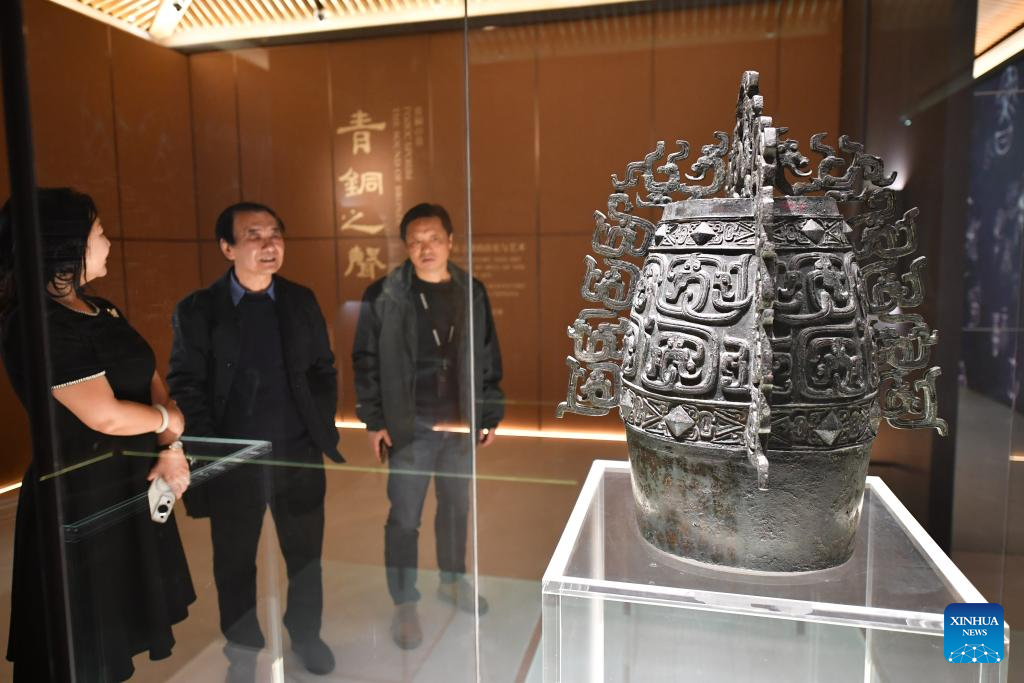 People look at an exhibit displayed at the airport museum in Terminal 5 of Xianyang International Airport, Xi'an, capital of northwest China's Shaanxi Province, Feb. 20, 2025. The Terminal 5 of the Xianyang International Airport was officially put into operation on Thursday. Covering an area of 705,500 square meters, which is bigger than the total areas of the T1, T2 and T3 terminals, Terminal 5 allows the same floor departure of domestic and international passengers. It also sets up a museum to display cultural relics unearthed in Shaanxi. (Xinhua/Shao Rui)