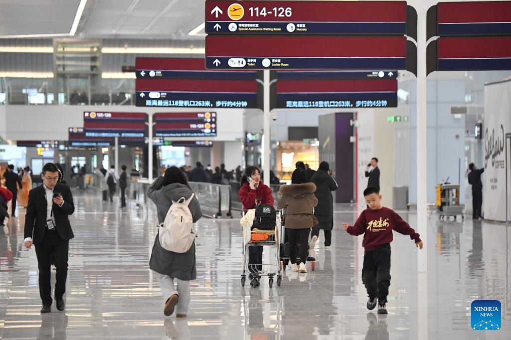 People walk at the departure hall of Terminal 5 of Xianyang International Airport in Xi'an, capital of northwest China's Shaanxi Province, Feb. 20, 2025. The Terminal 5 of the Xianyang International Airport was officially put into operation on Thursday. Covering an area of 705,500 square meters, which is bigger than the total areas of the T1, T2 and T3 terminals, Terminal 5 allows the same floor departure of domestic and international passengers. It also sets up a museum to display cultural relics unearthed in Shaanxi. (Xinhua/Shao Rui)