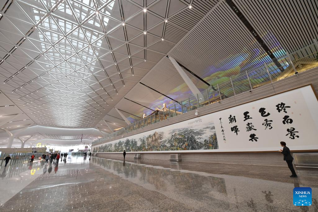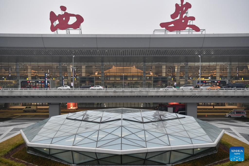 The Terminal 5 of Xianyang International Airport is seen in Xi'an, capital of northwest China's Shaanxi Province, Feb. 20, 2025. The Terminal 5 of the Xianyang International Airport was officially put into operation on Thursday. Covering an area of 705,500 square meters, which is bigger than the total areas of the T1, T2 and T3 terminals, Terminal 5 allows the same floor departure of domestic and international passengers. It also sets up a museum to display cultural relics unearthed in Shaanxi. (Xinhua/Shao Rui)