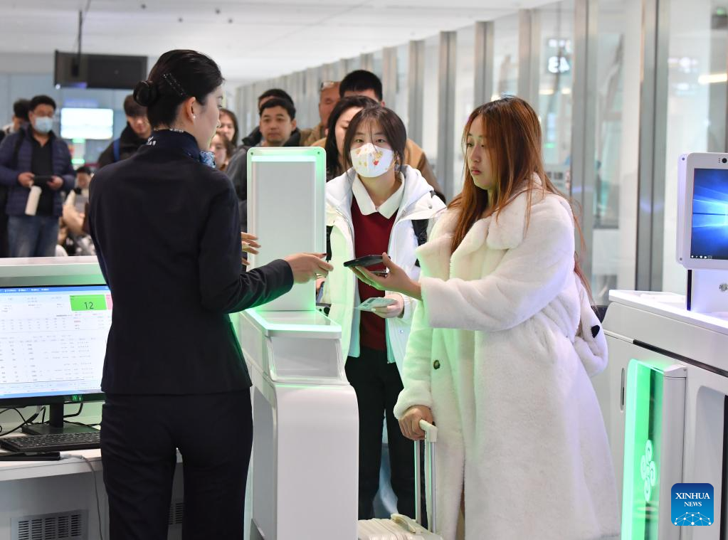 People check in at Terminal 5 of Xianyang International Airport in Xi'an, capital of northwest China's Shaanxi Province, Feb. 20, 2025. The Terminal 5 of the Xianyang International Airport was officially put into operation on Thursday. Covering an area of 705,500 square meters, which is bigger than the total areas of the T1, T2 and T3 terminals, Terminal 5 allows the same floor departure of domestic and international passengers. It also sets up a museum to display cultural relics unearthed in Shaanxi. (Xinhua/Shao Rui)