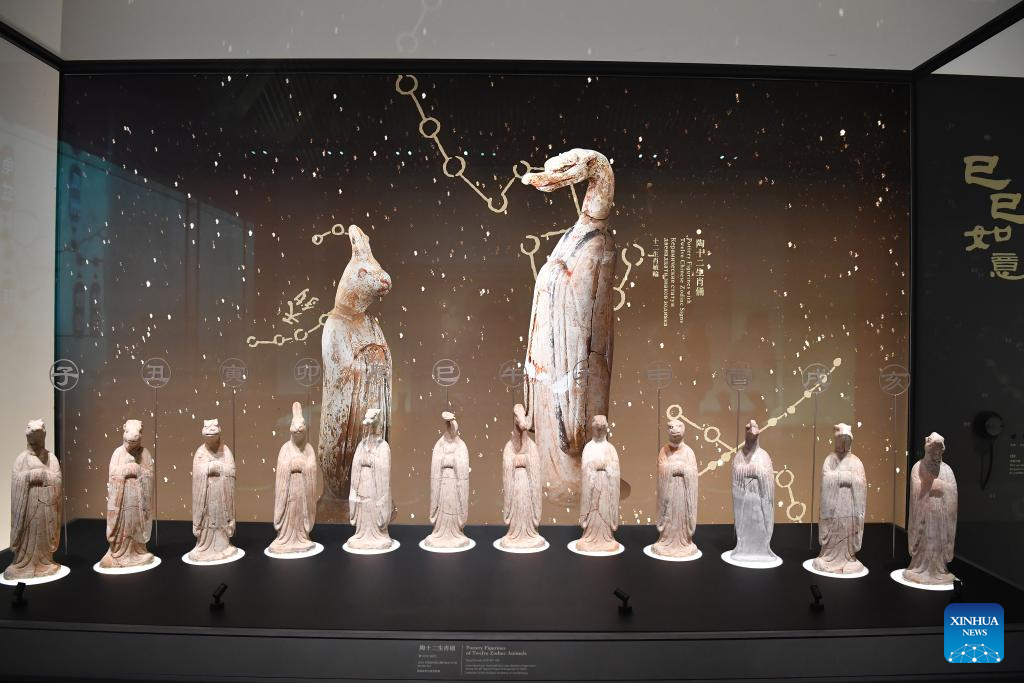 Exhibits are displayed at the airport museum in Terminal 5 of Xianyang International Airport, Xi'an, capital of northwest China's Shaanxi Province, Feb. 20, 2025. The Terminal 5 of the Xianyang International Airport was officially put into operation on Thursday. Covering an area of 705,500 square meters, which is bigger than the total areas of the T1, T2 and T3 terminals, Terminal 5 allows the same floor departure of domestic and international passengers. It also sets up a museum to display cultural relics unearthed in Shaanxi. (Xinhua/Shao Rui)