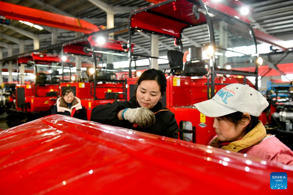 A staff member assembles a tractor in Rizhao Liying Machinery Manufacturing Co., Ltd. in Rizhao, east China's Shandong Province, Feb. 22, 2025. In recent years, local authorities in Rizhao have made efforts to assist traditional advantageous industries in innovating and develop an array of emerging and future-oriented industries. (Xinhua/Guo Xulei)