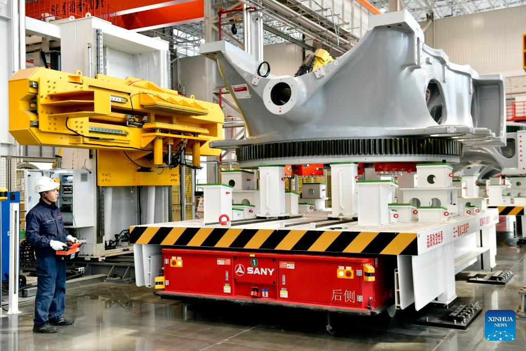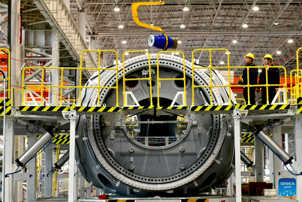 Staff work in a wind power equipment production workshop of Sany Renewable Energy (Rizhao) Wind Power Equipment Manufacturing Co., Ltd. in Rizhao, east China's Shandong Province, Feb. 22, 2025. In recent years, local authorities in Rizhao have made efforts to assist traditional advantageous industries in innovating and develop an array of emerging and future-oriented industries. (Xinhua/Guo Xulei)