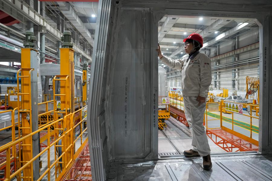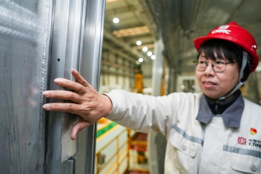 Sun Jingnan checks a welding job on a train carriage at a workshop of the CRRC Nanjing Puzhen Co., Ltd. in Nanjing, east China's Jiangsu Province, Feb. 20, 2025. (Xinhua/Li Bo)