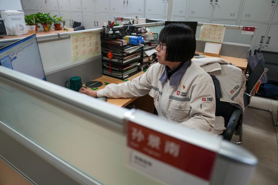 Sun Jingnan processes field survey documents at an office of the CRRC Nanjing Puzhen Co., Ltd. in Nanjing, east China's Jiangsu Province, Feb. 20, 2025. (Xinhua/Li Bo)
