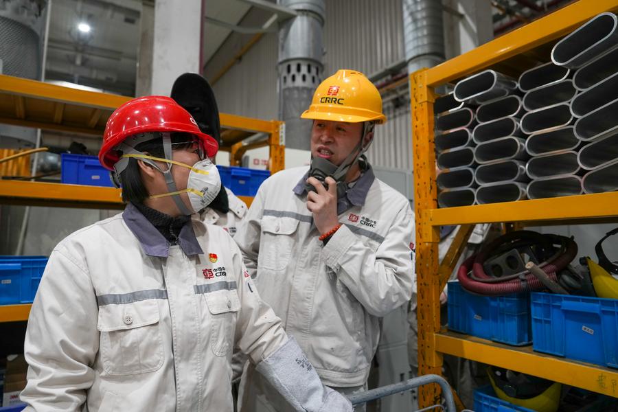 Sun Jingnan (R) instructs a colleague in welding operation at a workshop of the CRRC Nanjing Puzhen Co., Ltd. in Nanjing, east China's Jiangsu Province, Feb. 20, 2025. (Xinhua/Li Bo)