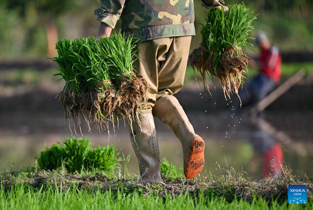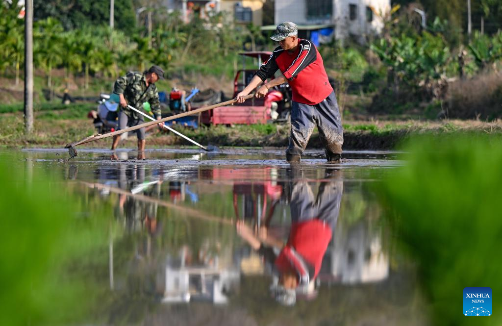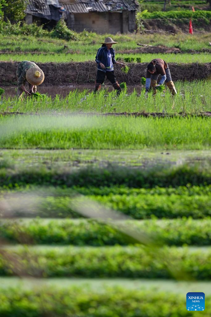 Farmers transplant rice seedlings in Yacha Town of Baisha Li Autonomous County, south China's Hainan Province, Feb. 20, 2025. Farming activities are in full swing in south China's Hainan Province in early spring. (Xinhua/Guo Cheng)