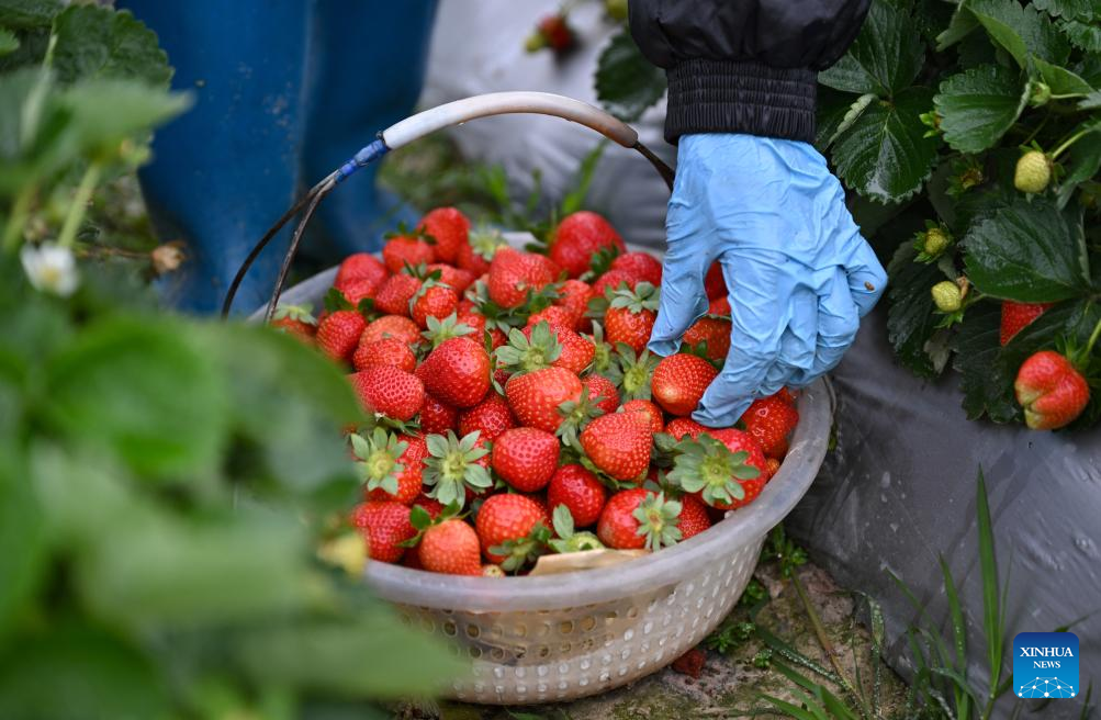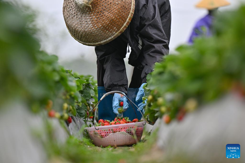 A farmer picks strawberries at Pingdi Village of Dongcheng Town in Danzhou City, south China's Hainan Province, Feb. 23, 2025. Farming activities are in full swing in south China's Hainan Province in early spring. (Xinhua/Guo Cheng)
