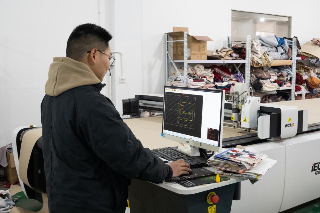 Xu Xiaolong, who heads the factory of Lu'an Zhongyuan Wedding Dress Co., Ltd., operates a computerized automatic cutting machine. (Xinhua/Zhao Jinzheng)
