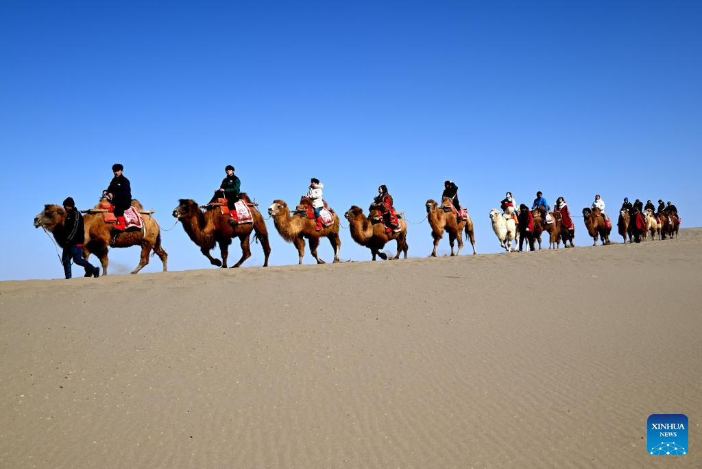 Tourists enjoy a camel ride at the Mingsha Mountain and Crescent Spring scenic spot in Dunhuang, northwest China's Gansu Province, Feb 23, 2025. (Photo by Zhang Xiaoliang/Xinhua)