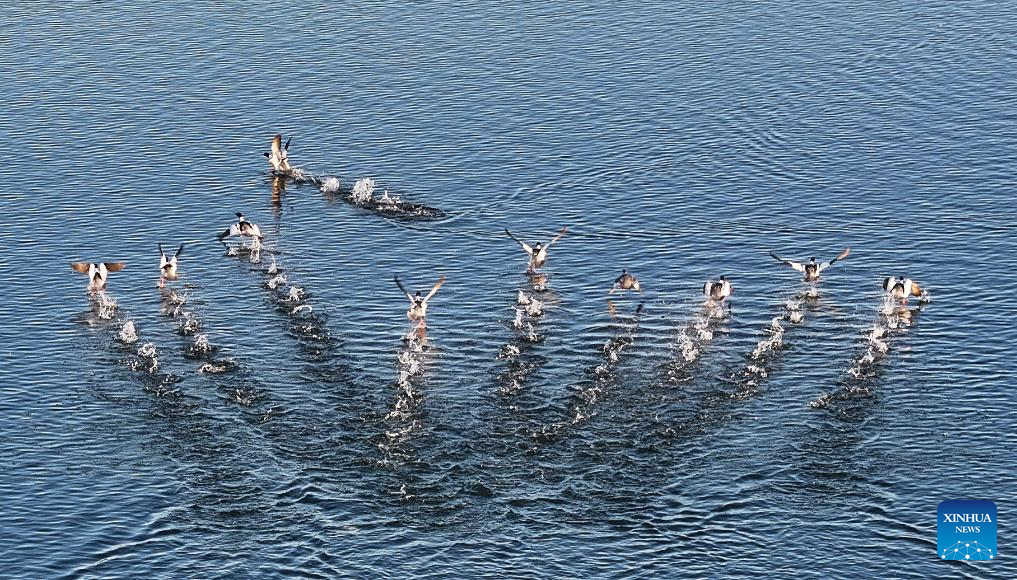 A drone photo taken on Feb 24, 2025 shows waterfowls on a lake in Zunhua, north China's Hebei Province. (Photo by Liu Mancang/Xinhua)