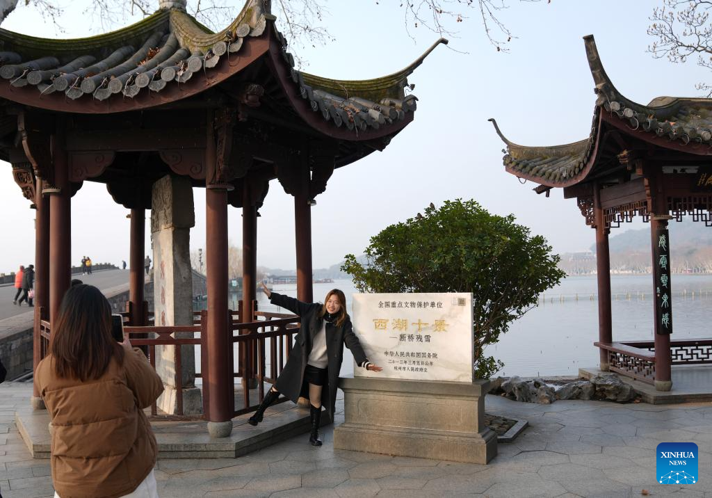 A tourist poses for photos by the Duanqiao Bridge (Broken Bridge) at the West Lake in Hangzhou, east China's Zhejiang Province, Feb. 24, 2025. In early spring, red plum blossoms and the willows in bloom at the West Lake scenic area in Hangzhou attracted numerous tourists. (Xinhua/Han Chuanhao)
