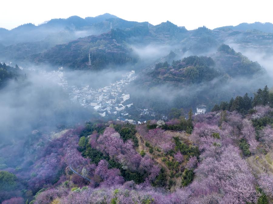 This aerial drone photo taken on Feb. 16, 2025 shows the plum blossoms at a village in Shexian County, Huangshan City, east China's Anhui Province. (Photo by Fan Chengzhu/Xinhua)
