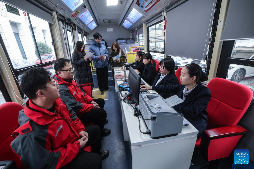 Employees of Galaxis Technology consult on policies at a mobile service station in Nanhu District of Jiaxing, east China's Zhejiang Province, Feb. 25, 2025. Local authorities in Nanhu District have continuously implemented diversified measures in recent years to address enterprises' demands, improve business environment, and promote healthy, high-quality development of private economy. (Xinhua/Xu Yu)