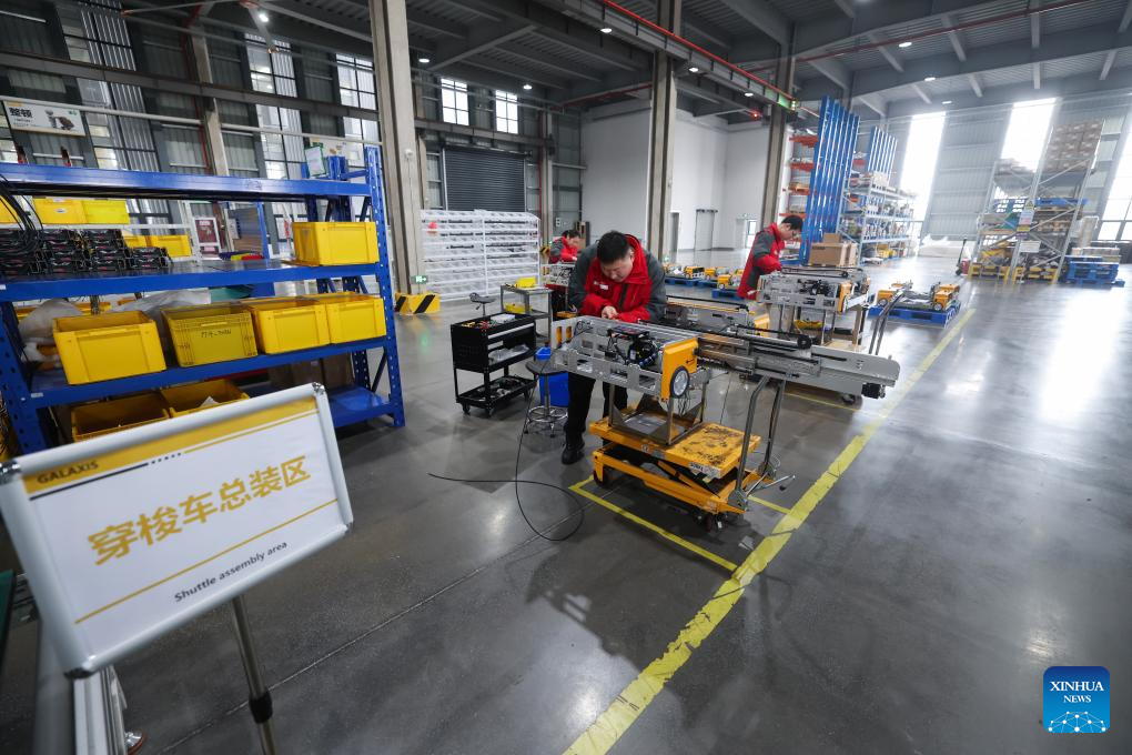 Employees work at the assembly area of shuttles in Galaxis Technology in Nanhu District of Jiaxing, east China's Zhejiang Province, Feb. 25, 2025. Local authorities in Nanhu District have continuously implemented diversified measures in recent years to address enterprises' demands, improve business environment, and promote healthy, high-quality development of private economy. (Xinhua/Xu Yu)