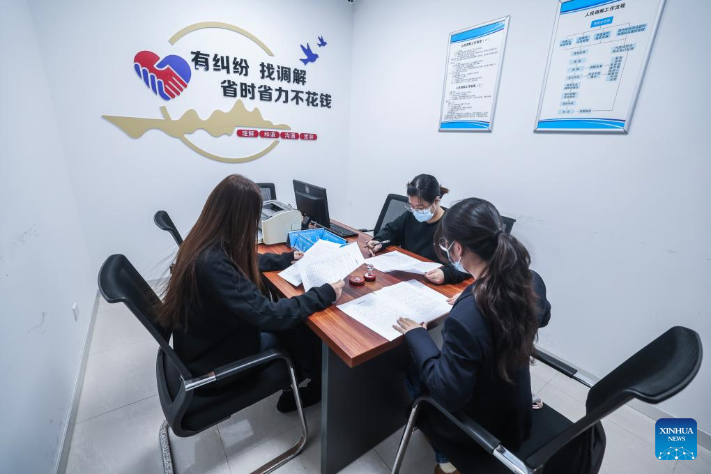 A staff member (1st R) mediates a dispute over a financial loan contract at a mediation center in Nanhu District of Jiaxing, east China's Zhejiang Province, Feb. 25, 2025. Local authorities in Nanhu District have continuously implemented diversified measures in recent years to address enterprises' demands, improve business environment, and promote healthy, high-quality development of private economy. (Xinhua/Xu Yu)