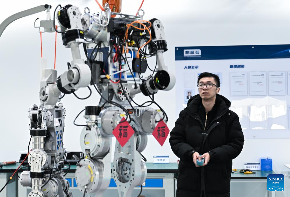 Zhu Wenxuan, a member of the R&D team of Wuhan Glory Road Intelligent Technology Co., Ltd., debugs the humanoid robot at the company in Wuhan, central China's Hubei Province, Feb. 24, 2025. Recently, the R&D team of Wuhan Glory Road Intelligent Technology Co., Ltd. has been fine-tuning the strength and dynamic balance of a humanoid robot from the "Laborer" series at the robotics laboratory.