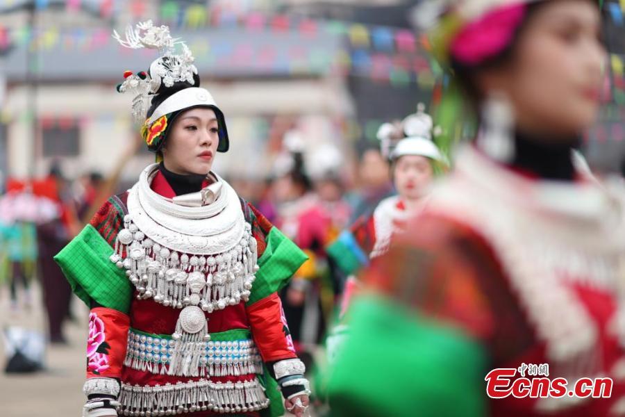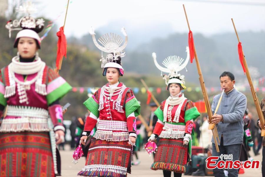 Women of the Miao ethnic group celebrate the "Wanghui" Festival in Danzhai county, southwest China's Guizhou Province, Mar. 15, 2018. (China News Service/Yang Wukui)
