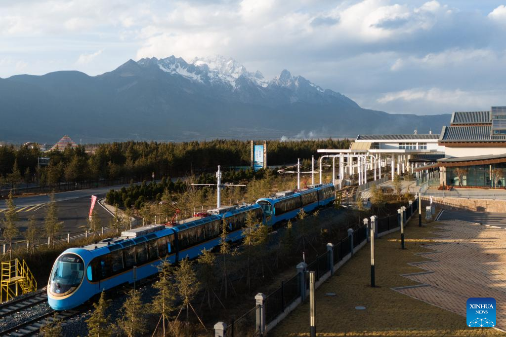 Tourists take a sightseeing train to enjoy the snow mountain scenery in southwest China's Yunnan Province, Feb. 25, 2025. A sightseeing train connecting Lijiang ancient town and Yulong Snow Mountain was launched here this February, becoming a new tourism hot spot in northwest Yunnan. (Photo by Peng Yikai/Xinhua)
