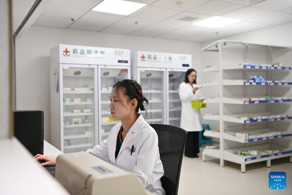 Medical workers are pictured at the outpatient pharmacy of the Perennial General Hospital Tianjin in Xiqing District of north China's Tianjin Municipality, Feb. 26, 2025. The Perennial General Hospital Tianjin, China's first wholly foreign-owned, tertiary general hospital, opened to public service here on Wednesday. This 500-bed hospital was built and owned by Singapore's Perennial Holdings Private Limited, with a total investment of about 1 billion yuan (about 138 million U.S. dollars), capable of comprehensive services including individualized medication. (Xinhua/Li Ran)