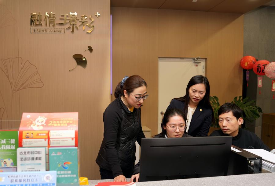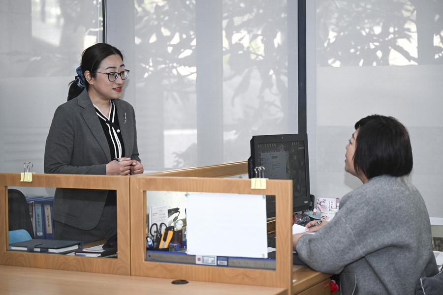 Sheng Hong (L) learns about property services at a residential community in Hongqiao Subdistrict of Changning District, east China's Shanghai, Feb. 15, 2025. (Xinhua/Liu Ying)