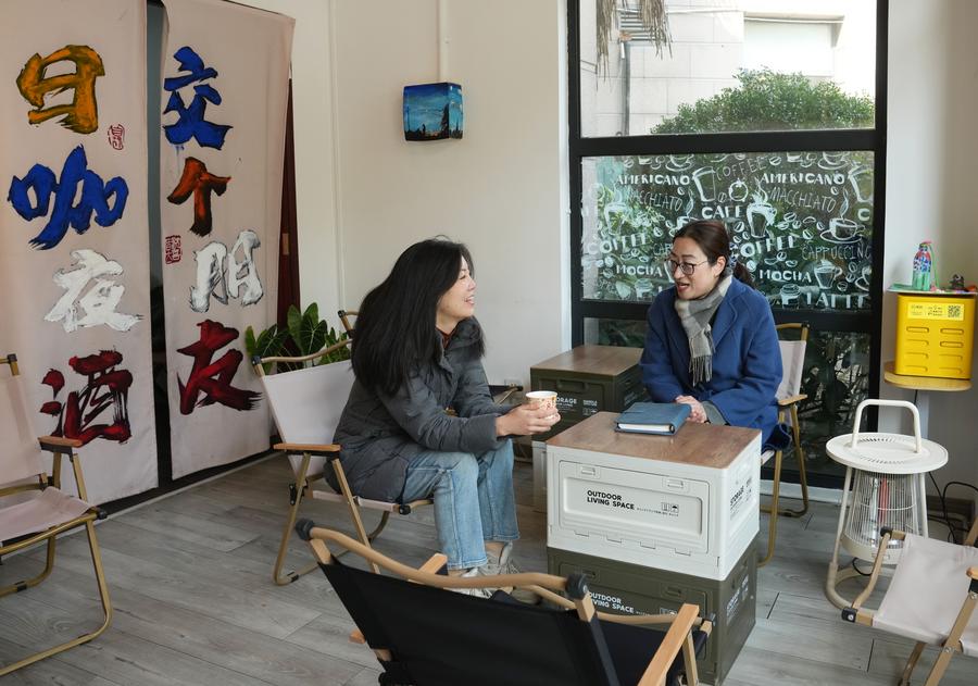 Sheng Hong (R) talks to the owner of a coffee shop at a residential community in Hongqiao Subdistrict of Changning District, east China's Shanghai, Feb. 24, 2025. (Xinhua/Liu Ying)