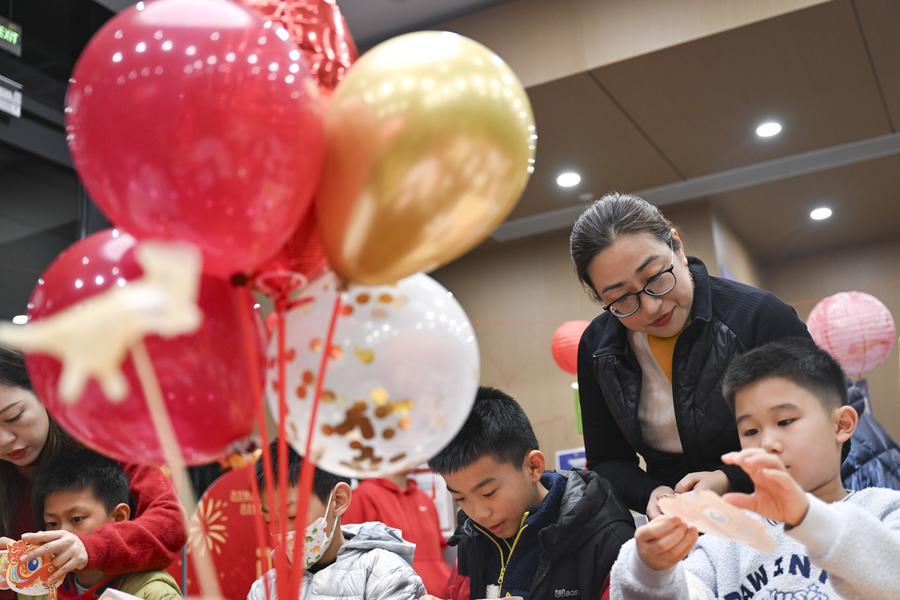 Sheng Hong (2nd R) interacts with a child during an event in celebration of the Lantern Festival at a residential community in Hongqiao Subdistrict of Changning District, east China's Shanghai, Feb. 15, 2025. (Xinhua/Chen Haoming)
