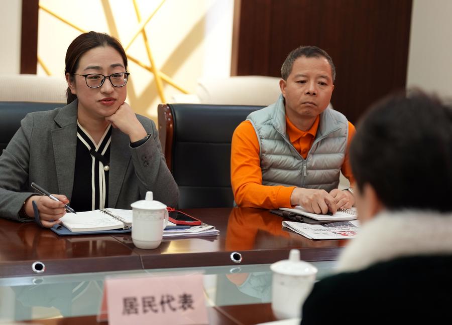 Sheng Hong (L) listens to a representative of the residents during a thematic discussion held at the Gubei civic center in Hongqiao Subdistrict of Changning District, east China's Shanghai, Feb. 12, 2025. (Xinhua/Liu Ying)