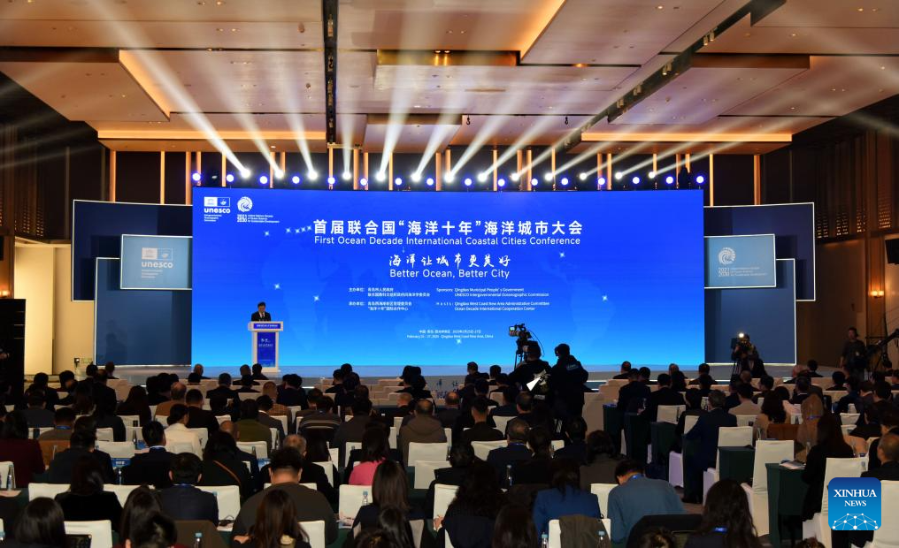 This photo taken on Feb. 26, 2025 shows the scene of the First Ocean Decade International Coastal Cities Conference in Qingdao, east China's Shandong Province. Hosted by the Qingdao Municipal People's Government in collaboration with UNESCO'S Intergovernmental Oceanographic Commission (IOC-UNESCO), the conference themed "Better Ocean, Better City" was held here on Wednesday to facilitate knowledge exchange and experience sharing on blue economy, climate change, and science-based solutions for sustainable development of coastal cities. (Xinhua/Li Ziheng)