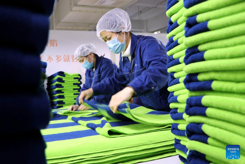 Workers process home textile products at a company in Binzhou, east China's Shandong Province, Feb. 25, 2025. Binzhou City is a major hub for private enterprises. In recent years, the city has fostered the development of private economy through comprehensive and end-to-end services. (Xinhua/Guo Xulei)