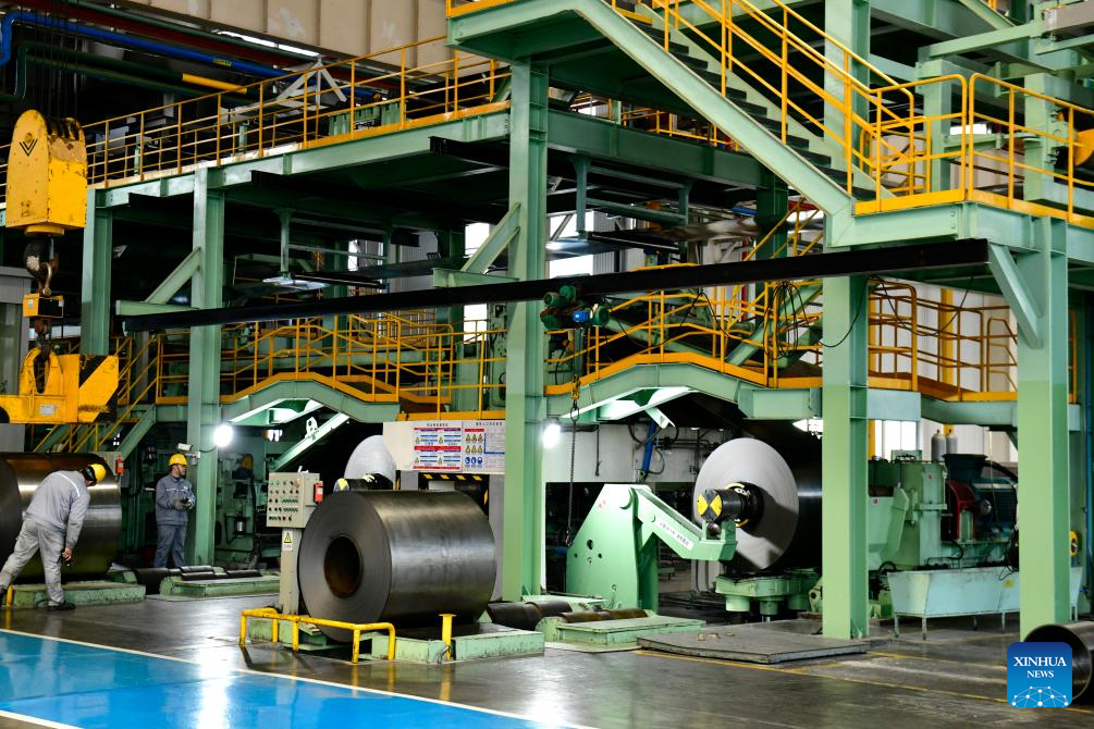 Workers process steel plates at the workshop of Shandong Xinmeida Technology Materials Co. Ltd. in Binzhou, east China's Shandong Province, Feb. 26, 2025. Binzhou City is a major hub for private enterprises. In recent years, the city has fostered the development of private economy through comprehensive and end-to-end services. (Xinhua/Guo Xulei)