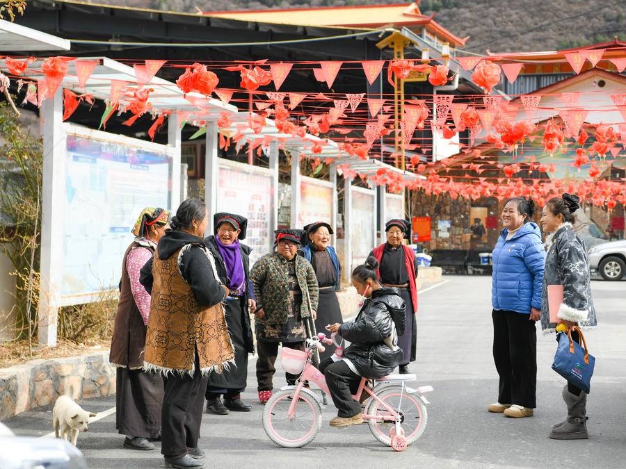 Gexi Wangmu (R) talks with seniors to learn about their daily living conditions in Songgang Village of Maerkang City, Aba Tibetan-Qiang Autonomous Prefecture, southwest China's Sichuan Province, Feb. 18, 2025. (Xinhua/Wang Xi)