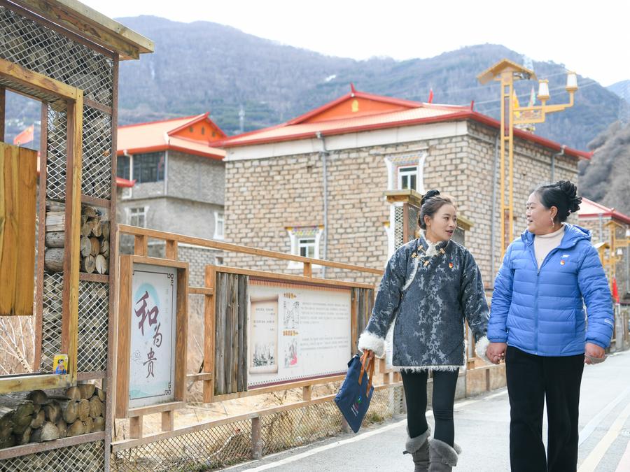 Gexi Wangmu (L) talks with Zhao Chunxiu, Party secretary of Songgang Village, in Songgang Village of Maerkang City, Aba Tibetan-Qiang Autonomous Prefecture, southwest China's Sichuan Province, Feb. 18, 2025. (Xinhua/Wang Xi)