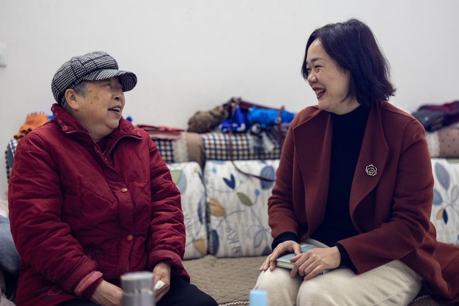 Wu Chengli visits a resident at Minzhu Village Community in Xiejiawan Sub-district of Jiulongpo District, southwest China's Chongqing Municipality, Feb. 25, 2025. (Xinhua/Huang Wei)