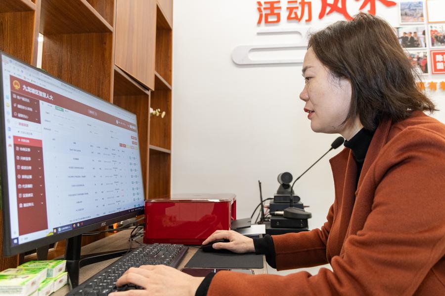 Wu Chengli addresses residents' concerns online at Minzhu Village Community in Xiejiawan Sub-district of Jiulongpo District, southwest China's Chongqing Municipality, Feb. 25, 2025. (Xinhua/Huang Wei)