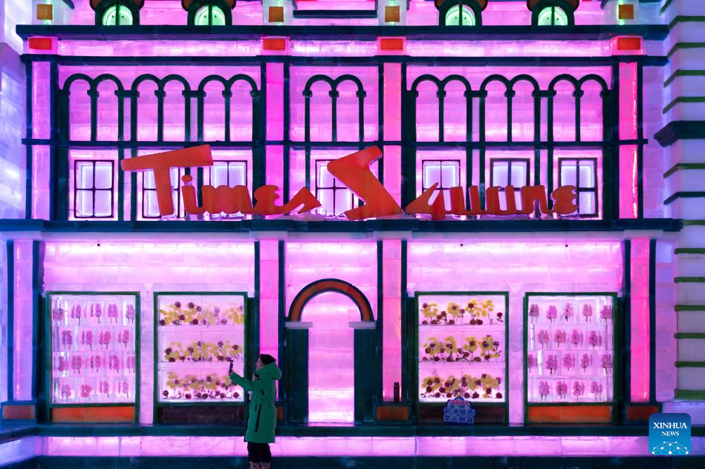 A visitor takes photos of the ice-and-snow landscapes at an indoor ice-and-snow theme park within Harbin Ice-Snow World in Harbin, northeast China's Heilongjiang Province, Feb. 27, 2025. The world's largest indoor ice-and-snow theme park, a facility located within Harbin Ice-Snow World, reopened on Thursday morning as the outdoor Harbin Ice-Snow World officially closed its 26th edition on Wednesday. Covering an area of 23,000 square meters, the indoor ice-and-snow attraction has seen a comprehensive refurbishment. Initially launched in July 2024, the facility features advanced audio-visual interactivity, vibrant ice sculptures, and elements from past editions of the park and the 2025 Asian Winter Games. (Xinhua/Zhang Tao)