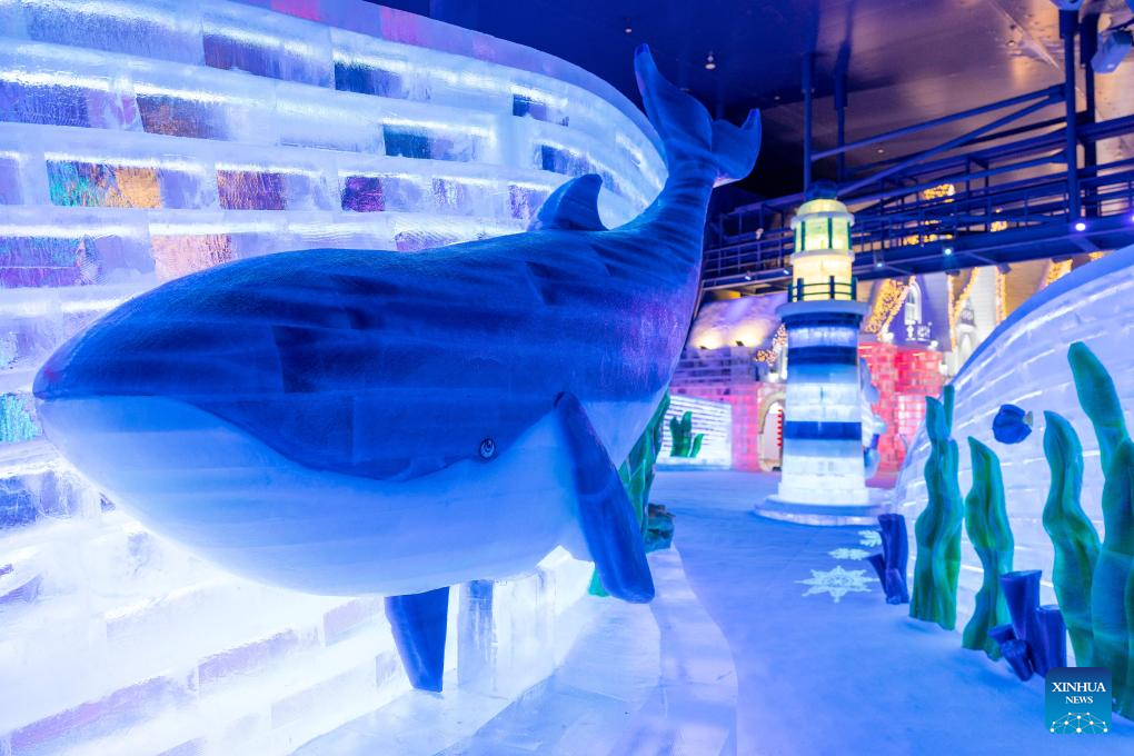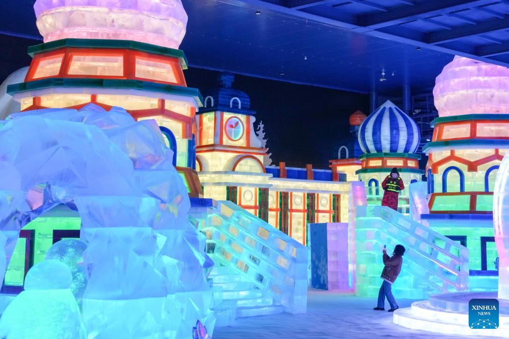 Tourists appreciate the ice-and-snow sculptures at an indoor ice-and-snow theme park within Harbin Ice-Snow World in Harbin, northeast China's Heilongjiang Province, Feb. 27, 2025. The world's largest indoor ice-and-snow theme park, a facility located within Harbin Ice-Snow World, reopened on Thursday morning as the outdoor Harbin Ice-Snow World officially closed its 26th edition on Wednesday. Covering an area of 23,000 square meters, the indoor ice-and-snow attraction has seen a comprehensive refurbishment. Initially launched in July 2024, the facility features advanced audio-visual interactivity, vibrant ice sculptures, and elements from past editions of the park and the 2025 Asian Winter Games. (Xinhua/Xie Jianfei)