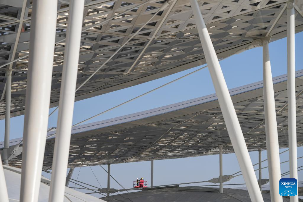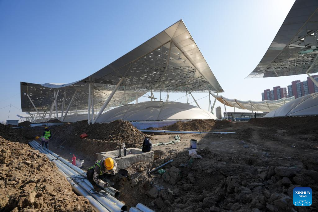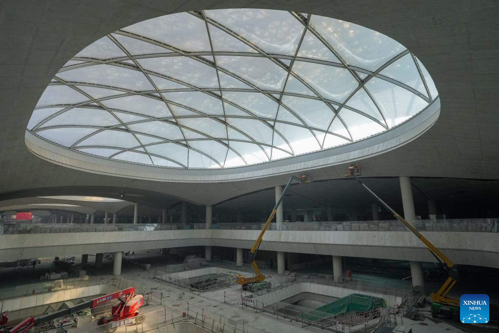 This photo taken on Feb. 26, 2025 shows the construction site of the Beijing sub-center comprehensive transportation hub in Tongzhou District, sub-center of Beijing, capital of China. The construction of the Beijing sub-center comprehensive transportation hub, Asia's largest underground transportation complex, is proceeding smoothly. The hub will link cross-regional and intercity railways, and several metro lines when completed as scheduled by the end of 2025. (Xinhua/Ju Huanzong)
